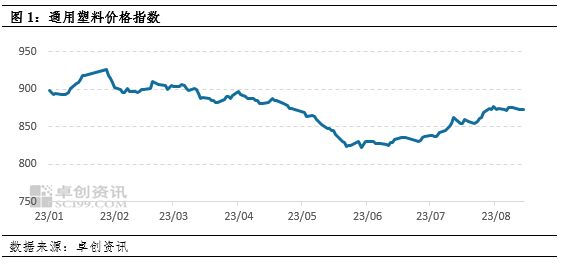 2023年8月至今(8月16日)塑料價格指數(shù)形成震蕩走勢,價格重心小幅下移,8月16日收于872.5,較月初下移0.78點,實際走勢與《塑料價格指數(shù)初現(xiàn)彩虹,但難以維系》中預測結論一致。價格波動的原因在于國內需求恢復不及預期,然而塑料產量隨著檢修結束進一步走高,原油市場走勢雖然跌宕起伏,但仍處于高位,對塑料市場產生支撐。