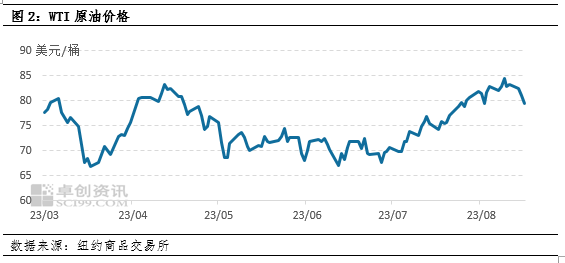 美原油價格從8月至今展現(xiàn)出沖高回落走勢,價格重心仍高于7月均值,對塑料市場起到托底作用。具體看,WTI原油主力合約價格從8月1號的80美元/桶升至10號的84美元/桶,最后下跌至8月17日的79美元/桶。上漲因素來源于8月3日沙特宣布把100/桶的減產計劃延長至9月,同時某國宣布將在9月繼續(xù)限制出口,進一步鞏固了市場供應偏緊預期。同時美國勞工部公布CPI數(shù)據(jù)低于市場預期,9月不加息可能性增加,導致原油價格上漲。后續(xù)市場連續(xù)四個交易日走弱,主要在于市場對于我國經濟增長的不確定性以及對于美國進一步加息的擔憂。綜合來看,原油作為成本端對塑料市場的托底效果正在邊際走弱。