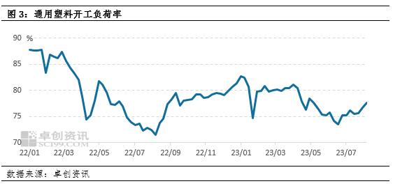 從行業(yè)角度來看,2023年7月我國塑料制品產量為651萬噸,環(huán)比下滑2.25個百分點,在去年基數(shù)較低的情況下,累計同比增長0.5%,更微觀角度來說,我國塑料下游綜合開工負荷率有所下降,表明了我國塑料產品需求有所下移。