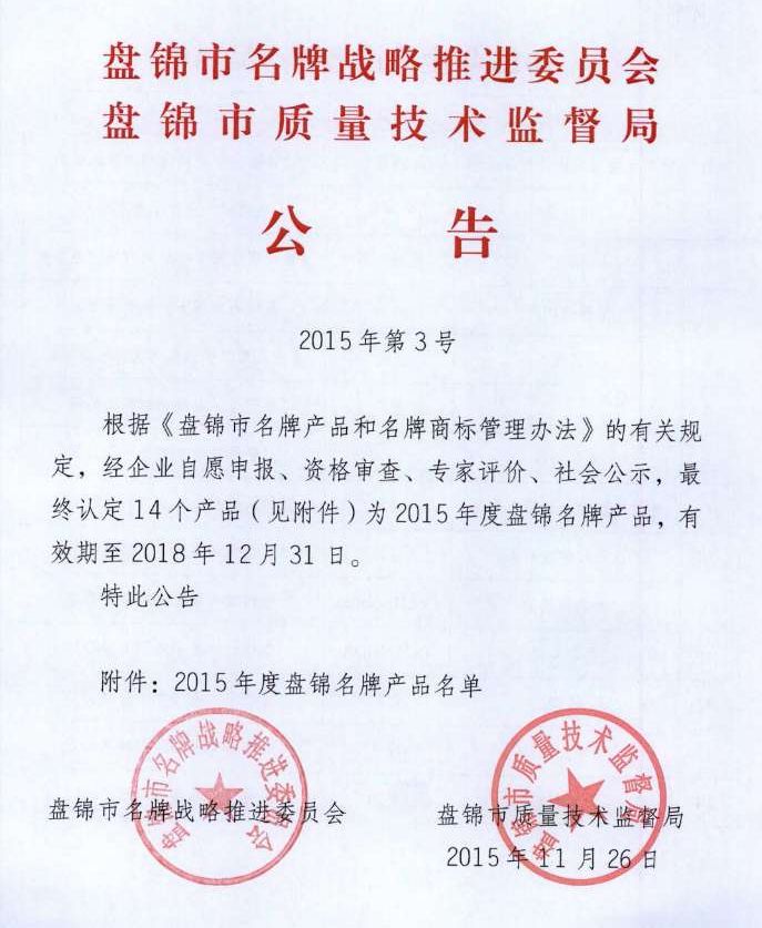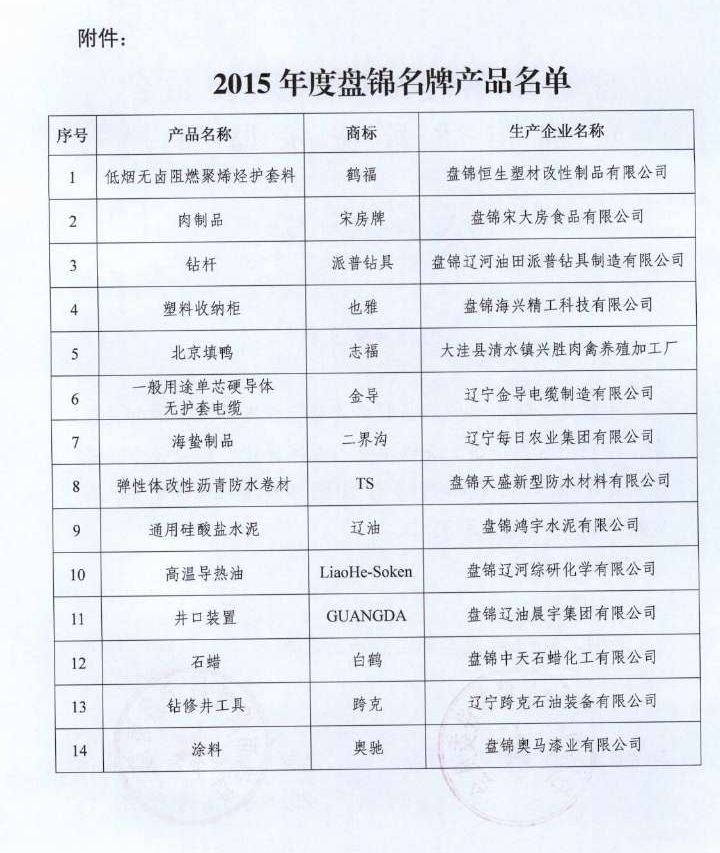 我公司產(chǎn)品——鶴福牌低煙無鹵阻燃聚烯烴護套料,通過盤錦市名牌戰(zhàn)略推進委員會、盤錦市質(zhì)量技術(shù)監(jiān)督局評價審核,被認定為2015年度盤錦名牌產(chǎn)品!