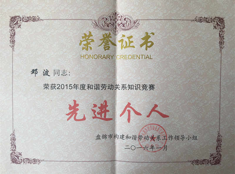 為貫徹黨的十八屆四中全會(huì)精神,推進(jìn)人力資源和社會(huì)保障法制建設(shè)進(jìn)程,切實(shí)提高構(gòu)建和諧勞動(dòng)關(guān)系的能力和水平,根據(jù)《中共中央、國(guó)務(wù)院關(guān)于構(gòu)建和諧勞動(dòng)關(guān)系的意見(jiàn)》文件精神,2015年11月份,在我市范圍內(nèi)開(kāi)展了和諧勞動(dòng)關(guān)系知識(shí)競(jìng)賽活動(dòng),此次競(jìng)賽有256戶(hù)企業(yè)近2500名勞動(dòng)者參與,我公司鄧波同志在此次知識(shí)競(jìng)賽中,表現(xiàn)優(yōu)異,榮獲“先進(jìn)個(gè)人”稱(chēng)號(hào)。